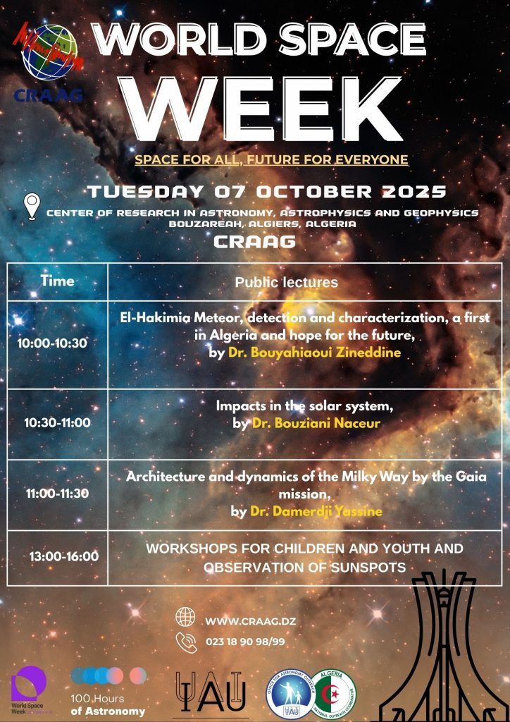 🔭 À l’occasion de la Semaine Mondiale de l’Astronomie, le Centre de Recherche en Astronomie, Astrophysique et Géophysique (CRAAG) organise une journée scientifique le 07 octobre, à partir de 10h00, au siège du centre.